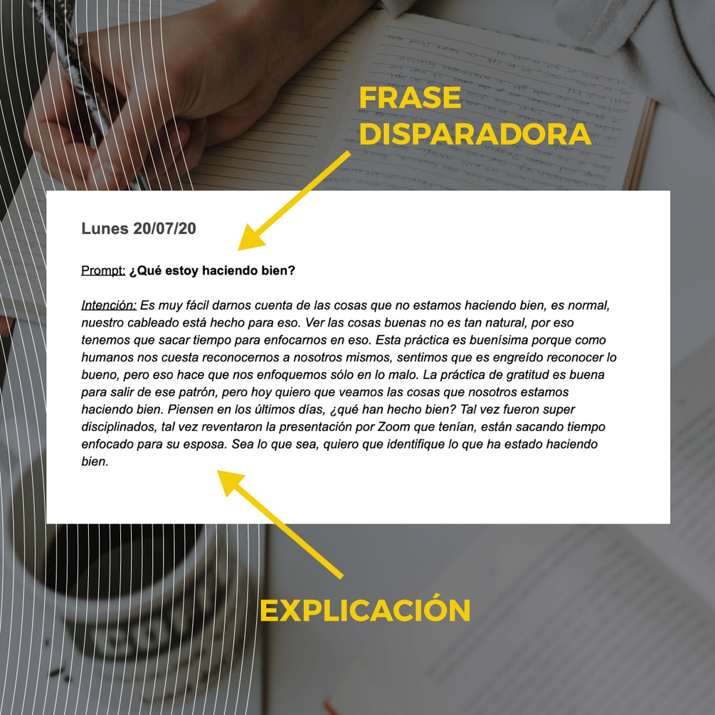 Cada mes va a recibir 15 “prompts” o frases disparadoras que van a guiar su práctica de ese día. Cada “prompt” tiene una intención con la que pueden entender mejor sobre qué escribir. No todos los días vamos a escribir cosas “pesadas”, también vamos a explorar cosas felices y cosas que nos van a ayudar a revisar como vamos periódicamente.